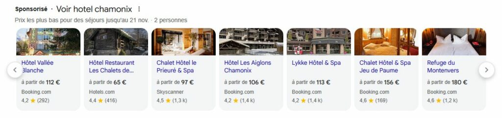 On remarque souvent l’omniprésence de Booking ou de Tripadvisor sur ces encarts et l’on croit à tort que ces placements leur sont réservés. Mais vous pouvez également y faire figurer votre hôtel si vous le souhaitez, en mettant en place une stratégie de campagnes sponsorisées sur Google Hôtel Ads.